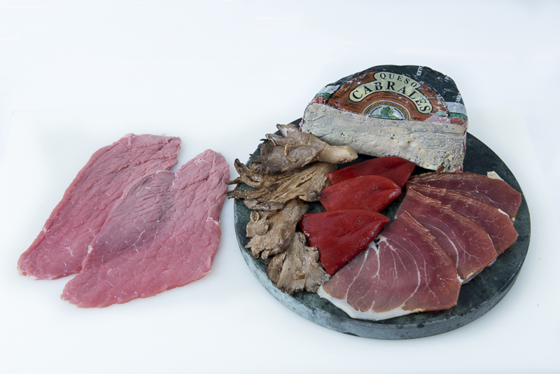 Setas, Queso cabrales, jamón, pimientos de piquillo.